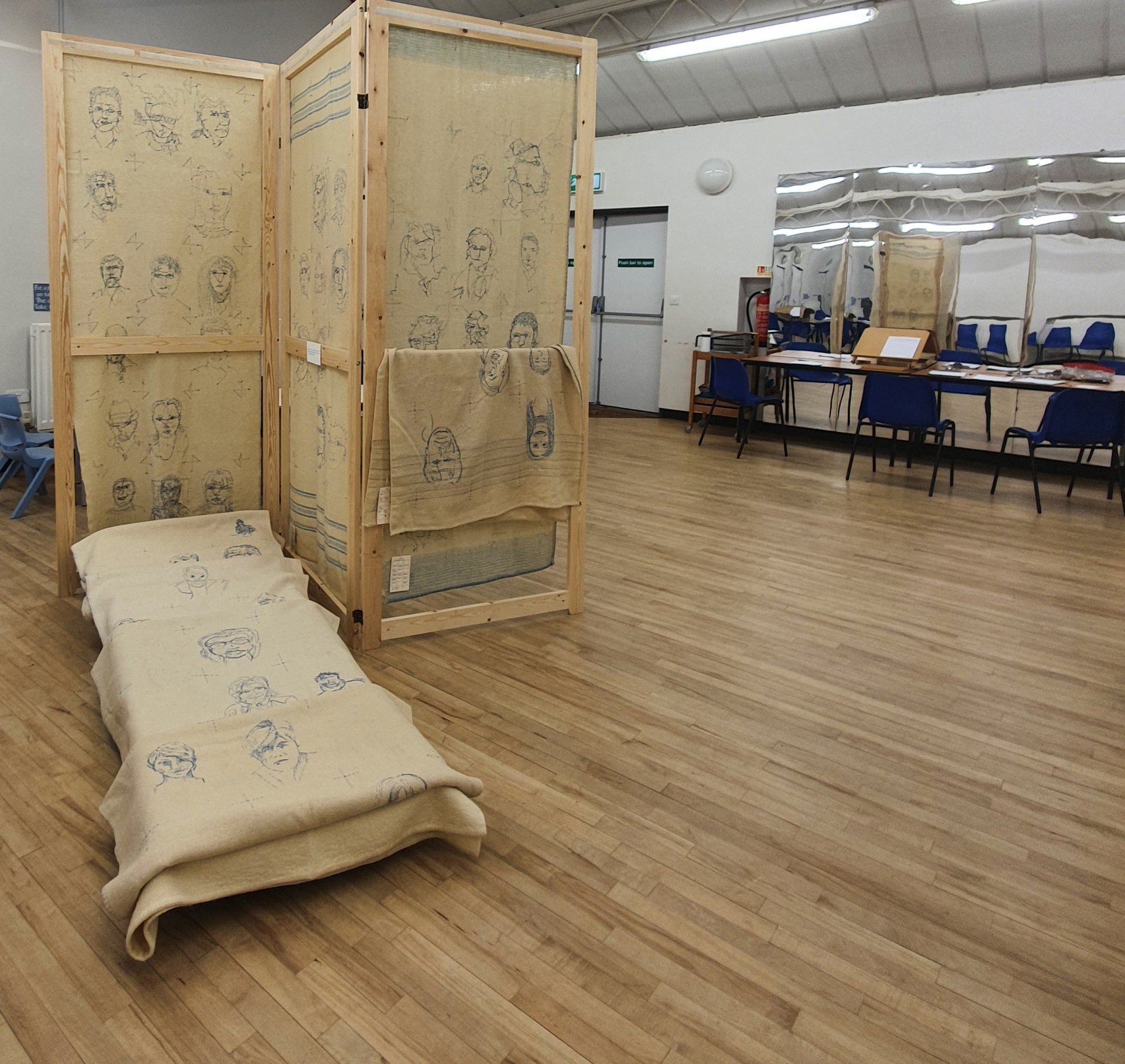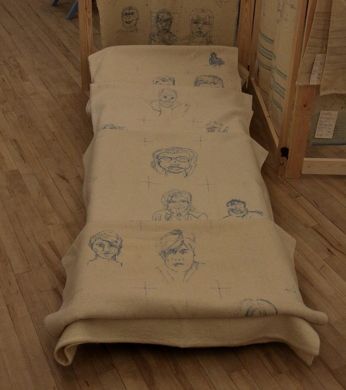 Everyone who draws a self-portrait is included in my hand-stitched work, using undyed recycled blankets and woad dyed yarn.